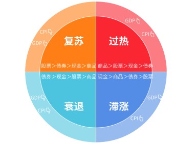 美林公司于2004年10月正式公布了投资时钟理论。美林的投资时钟根据美国1973—2003 年的月度数据,采用“经济增长GDP”和“通货膨胀CPI”的变动作为衡量经济周期的两个指标,把经济表现划分为衰退、复苏、过热和滞胀四个阶段,对应的最优资产类型划分为债券、股票、大宗商品和现金四类。专业投资者可以根据当前经济和通胀所处的阶段,增加其对应的最优资产类别。