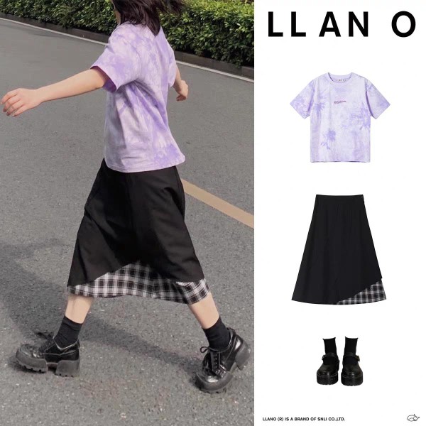 关注流行趋势的你一定知道,紫色是今年的流行色,那么选择一抹紫色度过这个夏天一定非常美满。这身搭配上衣是一件紫色的T恤,采用了深浅色的晕染设计,看起来给人一种冰镇葡萄的感觉,非常的清新干净。下身搭配一条黑色的a字裙,裙子的裙摆处是黑白色格子,给裙子的风格注入了活泼,打破了对称的传统美学。这身搭配也是非常基础百搭的。