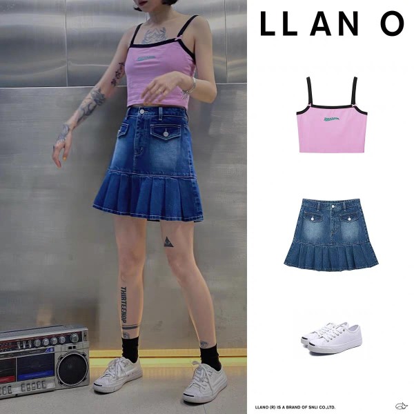 这款搭配看起来就非常清凉,吊带夏天穿起来真的特别凉快,紫色带着朋克风的感觉,看起来感觉超级酷。下身搭配一条深蓝色的牛仔裙,裙摆处是百褶的设计,看起来带着些甜美,也更加的灵动鲜活。这身搭配一双小白鞋非常合适,喜欢朋克风的可以穿一双黑色长腿袜,喜欢日常鞋的搭配一双黑色的袜子也很好看。
