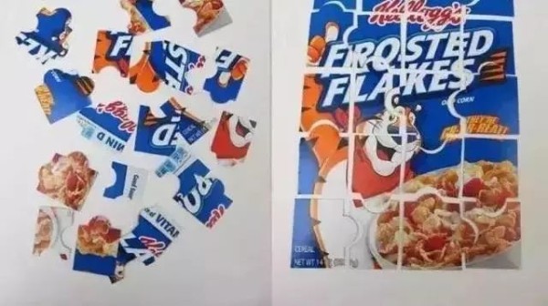 将麦片纸盒剪下,依孩子的能力水平将盒面剪成多张纸片进行拼图游戏。