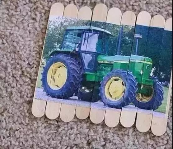雪糕棒拼在一起,用胶水粘贴上照片,再把雪糕棒打散,简易的拼图游戏就可以玩起来了~
