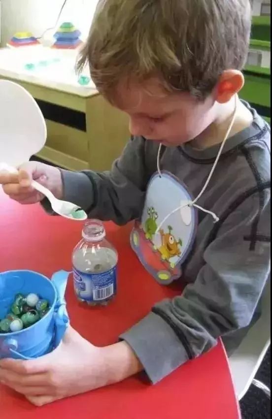 将盆子里的弹珠运送到小口塑料瓶中,让孩子了解事物有不同的大小,学会比较大小。