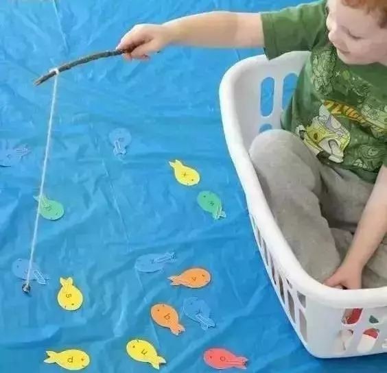 彩纸剪成小鱼形状,回形针别在小鱼上,木棍和绳子做成“鱼竿”,磁铁做“鱼饵”,用磁铁吸住小鱼身上的回形针。可以增加难度,让孩子找出相应的颜色和数量。