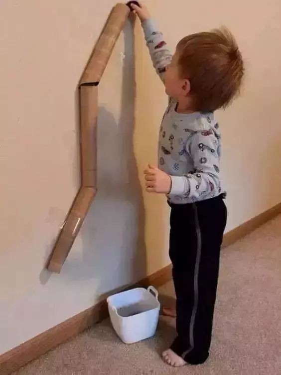 几个废旧纸筒用胶带绑在墙上,将玩具汽车、小球等等物品放入其中,还可以尝试改变轨道方向哦~