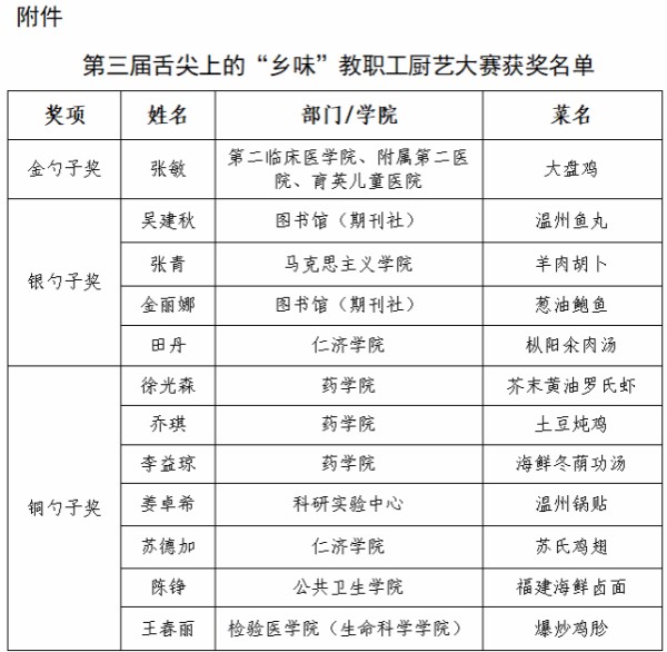 经过激烈角逐,最终,第二临床医学院、附属第二医院、育英儿童医院的张敏获得金勺子奖,图书馆(期刊社)的吴建秋等四人获得银勺子奖,药学院的徐光森等七人获得铜勺子奖。