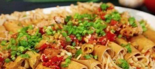 2、取豆胶一块,放上金针菇;把豆饺子卷起来,用刀切掉豆饺子的一端;那么谢谢