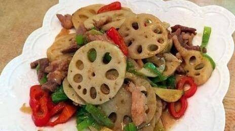2、五花肉去皮,切成薄片,用料酒、酱油、盐、十三香、味精、水淀粉腌10分钟入味,肉软去腥。.把莲藕切成薄片