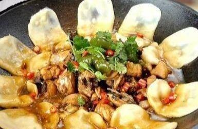 1只鸡或小公鸡;面粉约500克;2个土豆;葱、姜、蒜、八角、花椒、干辣椒各适量(喜欢吃辣的也可以点干辣椒);料酒、酱油、糖、盐、水、色拉油适量;2个青椒