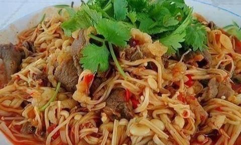 4.加入肥牛肉煮熟,待肉熟后加入泡好的面条(喜欢面条的可以不放);