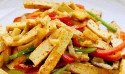 原料:青椒、熏干豆腐、瘦肉适量、生粉、豆瓣酱、料酒、姜、蒜、酱油、青椒。