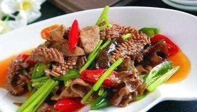 倒入大肠,快炒,倒入菜边的料酒继续翻炒出油。