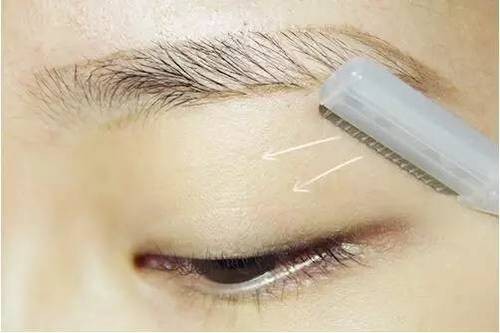 Step2:用修眉刀将眉毛下方,将小碎毛顺着箭头方向刮掉。↓