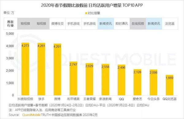 2020年春节假期比放假前日活用户的增量,抖音、快手、微博都突破了4000万。