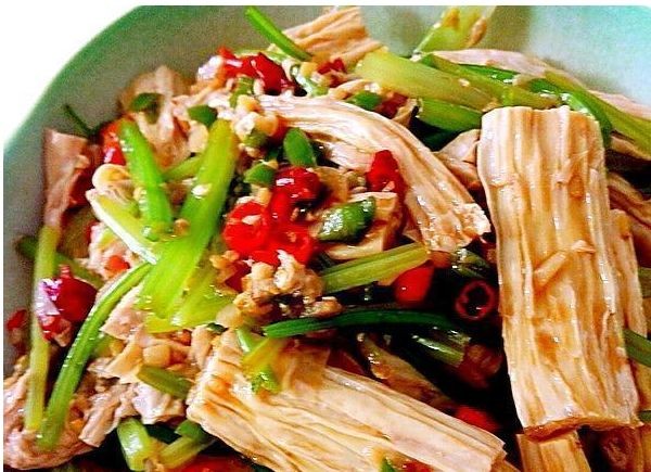 材料:腐竹、小米椒、青尖椒、干辣椒、姜、蒜、生抽、蚝油、盐、鸡精、香油、香芹;