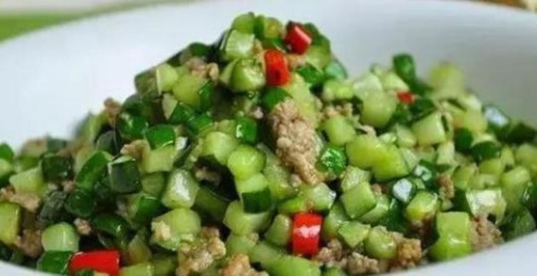 1.黄瓜洗净,切成1厘米见方的小丁,用少许盐腌渍10分钟,挤去水;猪瘦肉也切成相同大小的丁备用。