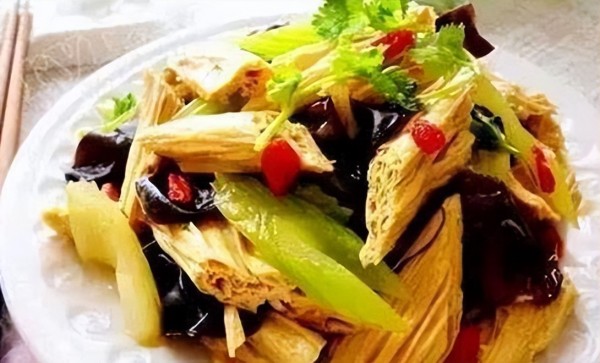 材料:腐竹、黑木耳适量(提前泡发),水芹菜,红椒