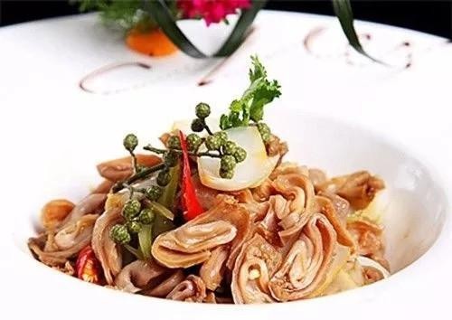 4、把泡入味的石斑鱼肚摆在上面,最后点缀红小米辣节、芹菜叶、炸香的鲜青花椒,即成。