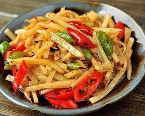 12.料汁冒泡后,加入炸好的切条下锅翻炒,使每根切条均匀裹满料汁即可。