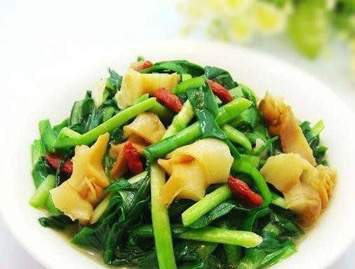 食材:海螺肉300克,韭菜300克,料酒,姜片,枸杞,盐,味精