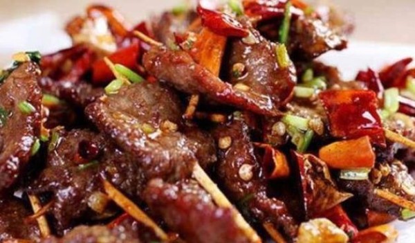 4、锅留底油,把姜蒜末爆香后倒入干辣椒爆香,倒入炸好的牙签牛肉,翻炒几下后,撒孜然粉,炒匀即可出锅装盘。