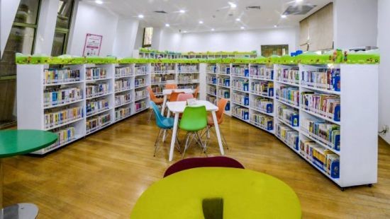 图书馆位于中心的一楼,被划分为成人阅读区和儿童阅读区。相比成人阅读区的宁静祥和,少儿阅览室则更具童趣,孩子们可以在这里找到有趣的绘本,坐在特制的椅子上阅读,经常有小朋友在这里一“泡”就是大半天。