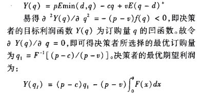 西方学者将季节性商品的决策问题称为报童模型(Newsvendor Model)。经典报童模型可以描述为一个决策者在需求不确定性环境下确定最优的产品库存量以最大化自身利润水平,常见的约束条件是产品生产周期较长、单一销售季节、销售季节相对较短,因此必须在销售季节开始前确定库存量,即仅有一次发生在季节开始前的生产、订购机会。设决策者的单位生产成本为c,单位零售价格为P,季末未售完商品的单位处理价格为口,令P>c>v。用d表示决策者所面临的随机需求,令f(x)和F(y)分别代表d的概率密度函数和累积分布函数。定义t+=max(O,t)。如决策者选择的库存量为,则决策者所面临的目标利润函数为: