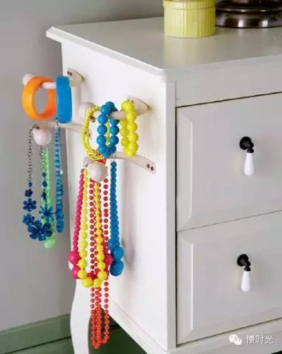 将窗帘的系带挂钩固定到梳妆台侧面或衣帽间的墙上,首饰、领带的收纳难题迎刃而解。手制挂钩可固定在梳妆台或床头柜上,换衣服时可搭配喜欢的首饰。
