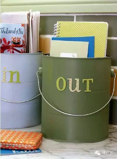 对小桶进行粉刷,然后用剪贴纸制作分类标签,贴在小桶上。如果担心物品混乱,可贴上小标签。