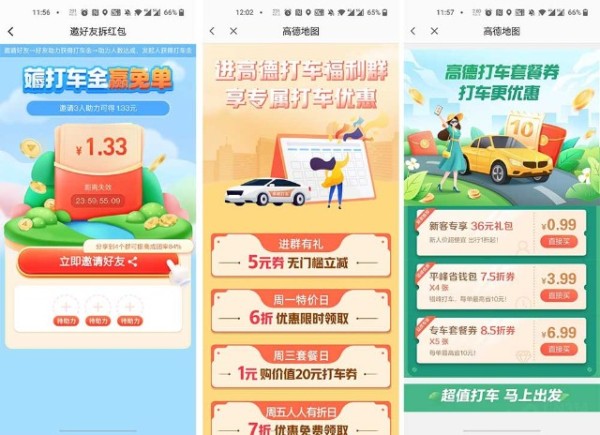 大家平时也要关注高德打车推出的活动,在近期就推出了有周五人人有折日、夏日出游打车单单省、薅打车金赢免单等,参与这些活动都是可以免费领到优惠券或用超低价买到优惠券套餐的。活动玩法每隔一段时间就会变化,在你打车前参与这些活动相信你的车费一定会超低。