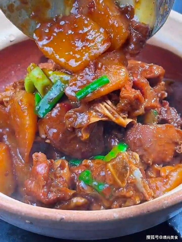 4、放入葱段,盖上盖子,小火慢炖35分钟,再加入白萝卜,继续炖15分钟,最后放点蒜苗,开大火收浓汤汁即可。