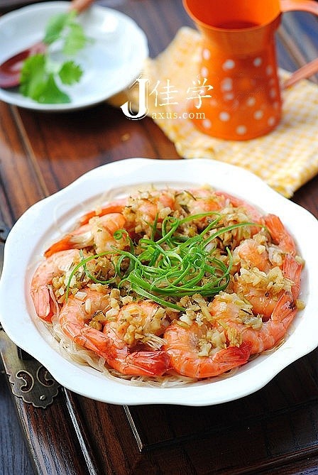【蒜蓉粉丝蒸大虾】【主料】鲜虾11只、粉丝1把、葱2根、姜2片、蒜5瓣、酱汁【配料】生抽1.5匙、陈醋1匙、香油1/2匙、水1匙、糖半匙、盐适量【做法】1、准备材料。2、将虾去头,并用刀将虾背部划开,挑出黑色的泥肠。3、将配料调成一碗酱汁备用,粉丝用温水泡发10分钟,葱姜蒜切末备用。4、泡好的粉丝沥干水分铺在大碗里,再将虾均匀的铺放在粉丝上。5、锅里烧热油,倒入葱姜蒜末炒香备用。6、将炒香的葱姜蒜末及油均匀的铺在虾上。7、倒上调好的酱汁拌匀。8、放入蒸锅中,水开后蒸8-9分钟取出装饰上葱丝即可