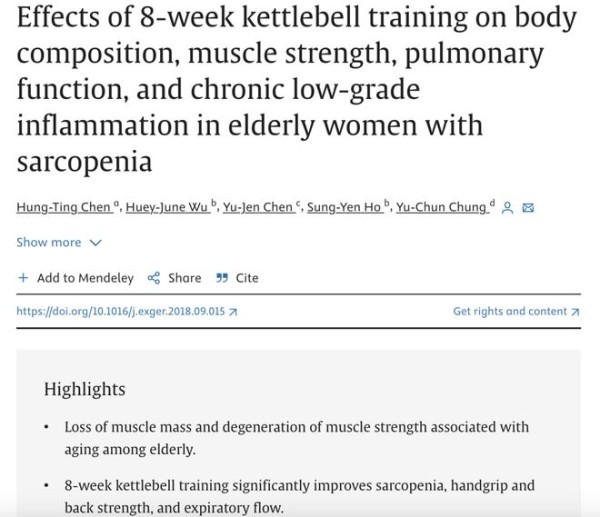 [2] Chen, H. T., Wu, H. J., Chen, Y., Ho, S., & Chung, Y. C. (2018). Effects of 8-week kettlebell training on body composition, muscle strength, pulmonary function, and chronic low-grade inflammation in elderly women with sarcopenia. Experimental Gerontology, 112, 112–118. https://doi.org/10.1016/j.exger.2018.09.015B3
