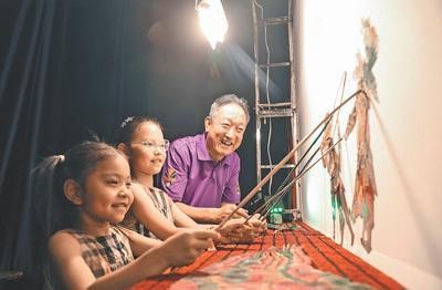 侯建川与孩子们共同表演孝义皮影戏。 人民网记者 王 帆摄