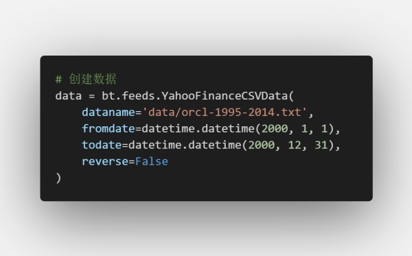 2.2 加载数据Backtrader 将数据集称作为 Data Feeds,默认的数据集是yahoo的股票数据,通过以下方式可以加载: