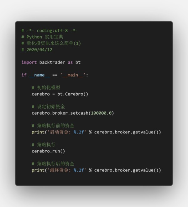2.1 资金与佣金Backtrader 初始化模型后,即可通过broker(经纪人)来设定初始资金,如下所示: