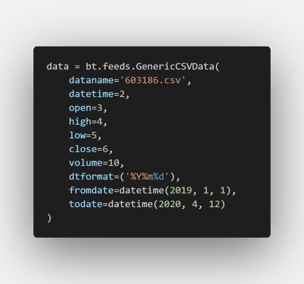 当然,载入自己的数据也是可以的,只不过你需要设定每个列的含义,比如开盘价在第4列,则open=3(从0开始算起),如下所示: