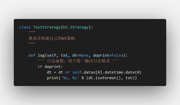 2.3 构建策略使用backtrader构建策略是一件很简单的事情,你只需要继承backtrader的策略类,并重写部分方法,就能实现策略。比如说重写属于我们自己的log函数: