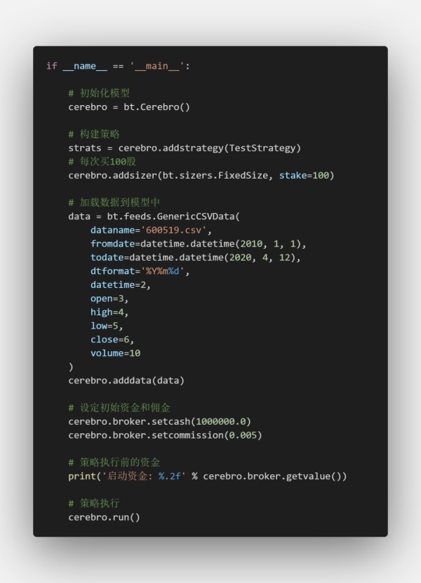最后补全策略就完成了,我们的backtrader策略如下,为了公众号的可读性,这里去掉了部分代码,详细的代码可阅读原文或后台回复 量化投资1 下载: