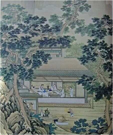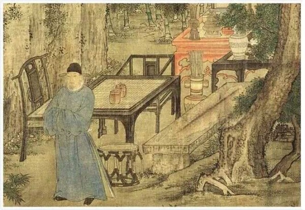 ·仇英的《临宋人画轴》就展示了一个并不奢华却意境别致的明代文人书房。画面中心一屏一榻,屏是独扇的山水插屏,榻上坐一个文人,脚下是一个脚踏;床右侧置一靠几,既可靠在身后,又可搭放脚足。画面右侧的书案、绣墩显然并非名贵木材制成,但案上书卷琴棋整齐有序。床榻旁站一童子,手持注子向盏中注酒。酒盏边除了果盘之外,又设砚台一方。画面左下角是一个茶炉,纱罩下放着饮茶用的托盏。明代文人经常在书房内召集文友,进行雅集活动。在文人聚会时,通常少不了两样东西,一是琴,因为要携琴访友;一是茶炉,要烹茶待客。