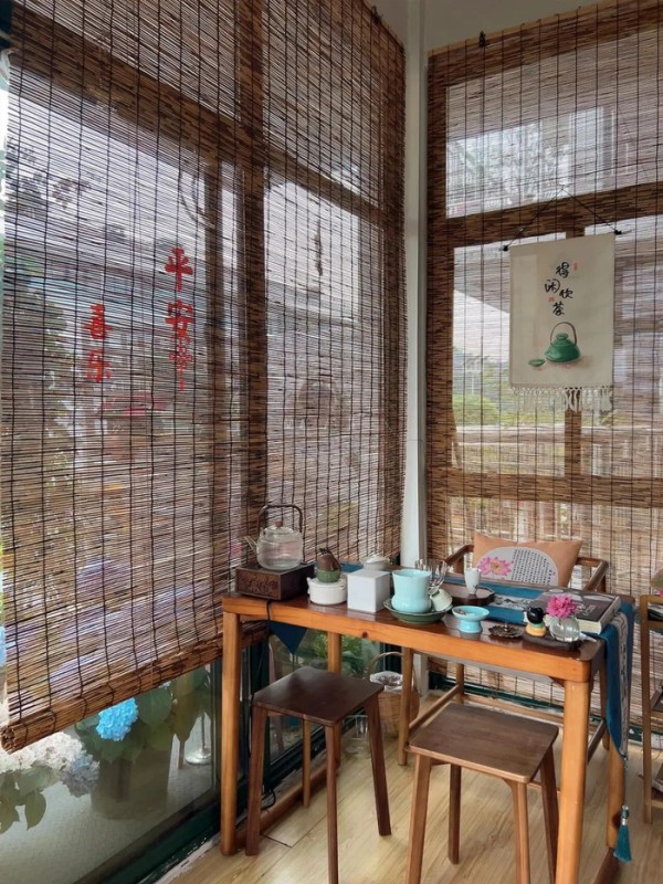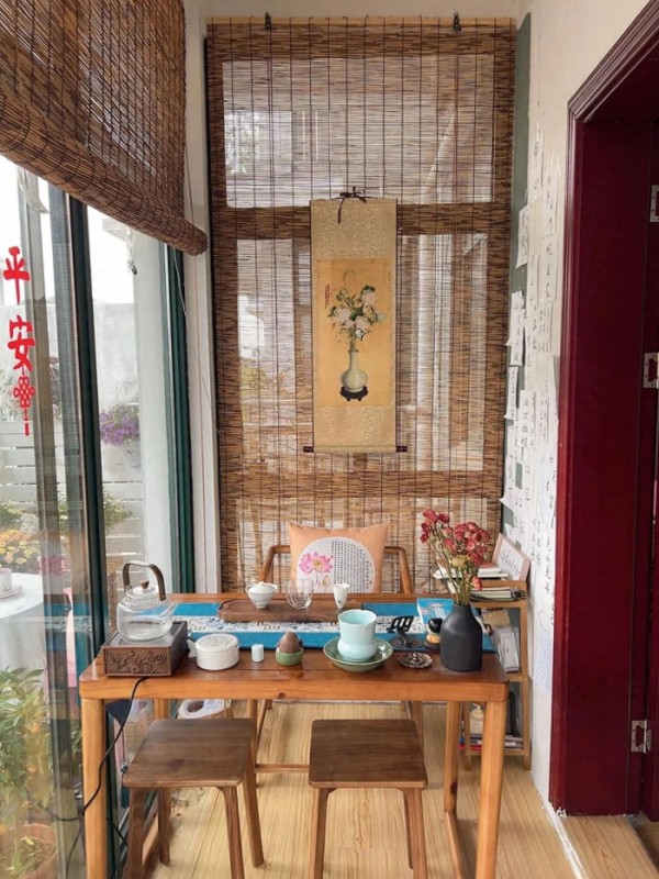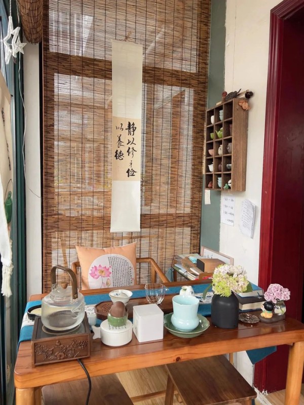 阿姨还特别有心思,用竹帘代替普通纱帘,挂上一幅简约小古画,再摆上琳琅满目的茶具、可爱的茶宠,妥妥的古风茶室就成型了,哪个爱茶的人能不被吸引呢?