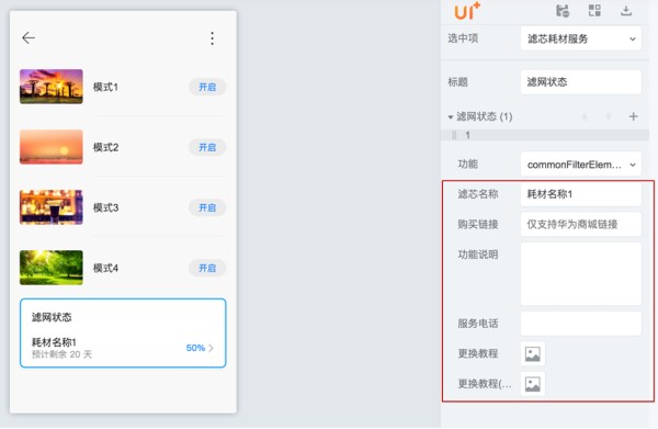 c.(仅适用于滤芯耗材)选中滤芯耗材组件,进行如下配置:更改滤芯名称、添加购买链接(仅支持华为商城链接)、添加功能说明及服务电话(显示在详情页)、更换教程(支持上传整图的方式)。