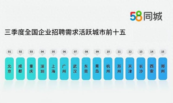 在招聘活跃度排名前十五的城市中,北京、上海、青岛、苏州、郑州招聘需求环比涨幅均超过10%,其中北京以11%的涨幅位列前列。