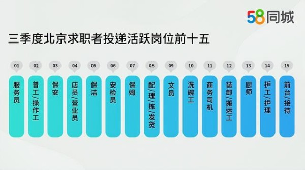 数据显示,三季度北京前十五热门职类招聘需求环比上涨6.7%。其中,后厨、配菜、服务员岗位环比涨幅超过20%,成为就业市场最大亮点。
