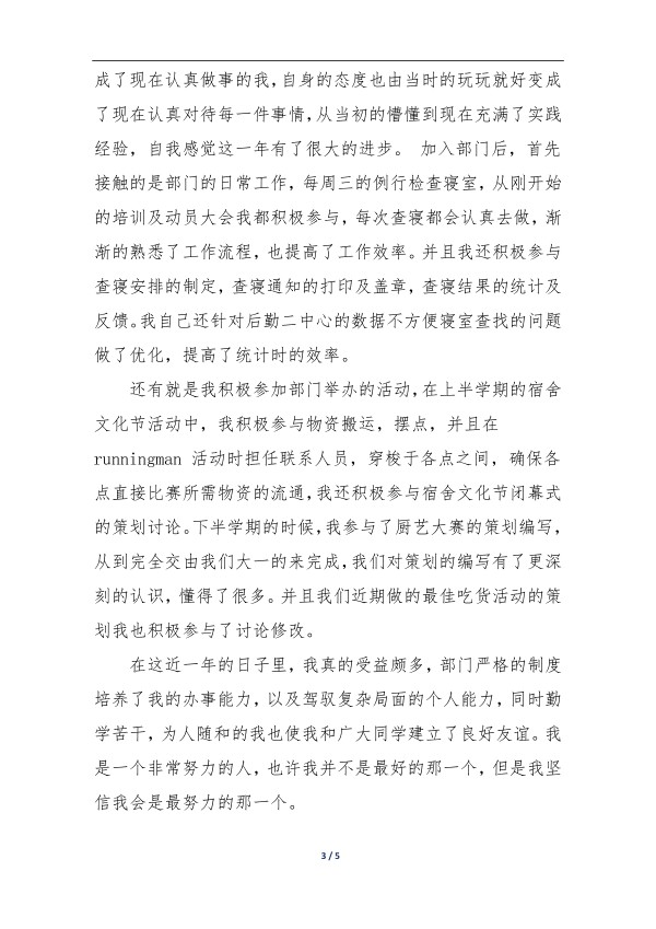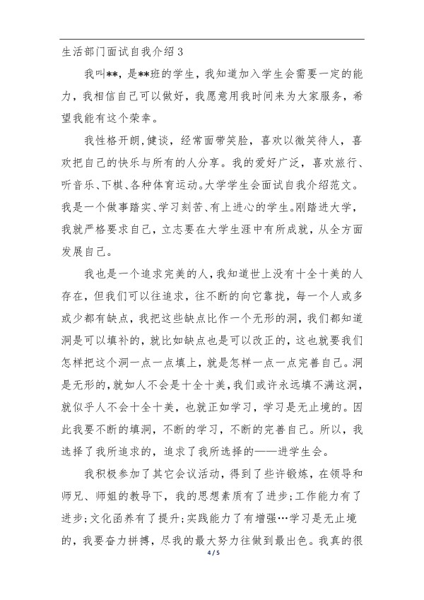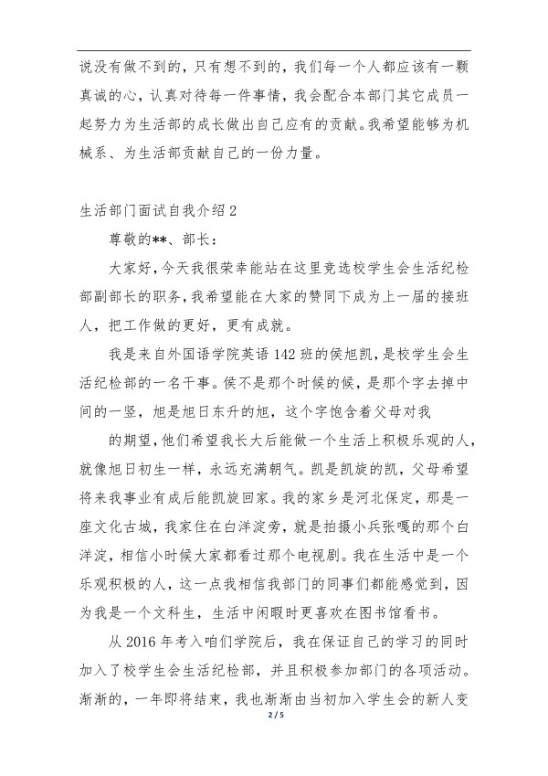 1/5生活部门面试自我介绍范例精编3篇生活部门面试自我介绍1化机**班,张三,性别:男,有现担任校社联督导部干事的经历,性格开朗,具有较好的社交能力,做事认真,办事效率高,具有一定的组织与领导能力,工作严谨踏实,具有团体协作意识,思想上积极进取。校社联曾成功的举办过许多次活动,积累了丰富的经验,获得校社联老师们的一致好评,并多次获得优秀先进个人荣誉称号。并且了解生活部的日常事务,并且熟知生活部的职责,在这一年当中,参加了机械系所有的活动,对机械系、对生活部有一个较全面的认识,工作能力在生活部工作的经历方有了较大的提高。生活部以创造温馨和谐的宿舍为基准,我宿舍已在我的带领下成为校级、系级文明宿舍,以后我将尽心尽力的做好自己的本职工作,始终坚持原则,因此,我以后将会更加严已律己,对此采取以下俩点来处理生活部的日常事务:1、对每一个宿舍的卫生情况如实记录,并上交给系主任、辅导员批阅并存档2、以最饱满的热情去管理每一个宿舍,以最良好的心态去迎接我们即将面临的每一次挑战,把生活部当成一个大家庭,努力把这个大家庭变的更加温馨,更加有影响力最后,我想2/5说没有做不到的,只有想不到的,我们每一个人都应该有一颗真诚的心,认真对待每一件事情,我会配合本部门其它成员一起努力为生活部的成长做出自己应有的贡献。我希望能够为机械系、为生活部贡献自己的一份力量。生活部门面试自我介绍2尊敬的**、部长:大家好,今天我很荣幸能站在这里竞选校学生会生活纪检部副部长的职务,我希望能在大家的赞同下成为上一届的接班人,把工作做的更好,更有成就。我是来自外国语学院英语142班的侯旭凯,是校学生会生活纪检部的一名干事。侯不是那个时候的候,是那个字去掉中间的一竖,旭是旭日东升的旭,这个字饱含着父母对我的期望,他们希望我长大后能做一个生活上积极乐观的人,就像旭日初生一样,永远充满朝气。凯是凯旋的凯,父母希望将来我事业有成后能凯旋回家。我的家乡是河北保定,那是一座文化古城,我家住在白洋淀旁,就是拍摄小兵张嘎的那个白洋淀,相信小时候大家都看过那个电视剧。我在生活中是一个乐观积极的人,这一点我相信我部门的同事们都能感觉到,因为我是一个文科生,生活中闲暇时更喜欢在图书馆看书。从2016年考入咱们学院后,我在保证自己的学习的同时加入了校学生会生活纪检部,并且积极参加部门的各项活动。渐渐的,一年即将结束,我也渐渐由当初加入学生会的新人变3/5成了现在认真做事的我,自身的态度也由当时的玩玩就好变成了现在认真对待每一件事情,从当初的懵懂到现在充满了实践经验,自我感觉这一年有了很大的进步。加入部门后,首先接触的是部门的日常工作,每周三的例行检查寝室,从刚开始的培训及动员大会我都积极参与,每次查寝都会认真去做,渐渐的熟悉了工作流程,也提高了工作效率。并且我还积极参与查寝安排的制定,查寝通知的打印及盖章,查寝结果的统计及反馈。我自己还针对后勤二中心的数据不方便寝室查找的问题做了优化,提高了统计时的效率。还有就是我积极参加部门举办的活动,在上半学期的宿舍文化节活动中,我积极参与物资搬运,摆点,并且在runningman活动时担任联系人员,穿梭于各点之间,确保各点直接比赛所需物资的流通,我还积极参与宿舍文化节闭幕式的策划讨论。下半学期的时候,我参与了厨艺大赛的策划编写,从到完全交由我们大一的来完成,我们对策划的编写有了更深刻的认识,懂得了很多。并且我们近期做的最佳吃货活动的策划我也积极参与了讨论修改。在这近一年的日子里,我真的受益颇多,部门严格的制度培养了我的办事能力,以及驾驭复杂局面的个人能力,同时勤学苦干,为人随和的我也使我和广大同学建立了良好友谊。我是一个非常努力的人,也许我并不是最好的那一个,但是我坚信我会是最努力的那一个。4/5生活部门面试自我介绍3我叫**,是**班的学生,我知道加入学生会需要一定的能力,我相信自己可以做好,我愿意用我时间来为大家服务,希望我能有这个荣幸。我性格开朗,健谈,经常面带笑脸,喜欢以微笑待人,喜欢把自己的快乐与所有的人分享。我的爱好广泛,喜欢旅行、听音乐、下棋、各种体育运动。大学学生会面试自我介绍范文。我是一个做事踏实、学习刻苦、有上进心的学生。刚踏进大学,我就严格要求自己,立志要在大学生涯中有所成就,从全方面发展自己。我也是一个追求完美的人,我知道世上没有十全十美的人存在,但我们可以往追求,往不断的向它靠拢,每一个人或多或少都有缺点,我把这些缺点比作一个无形的洞,我们都知道洞是可以填补的,就比如缺点也是可以改正的,这也就要我们怎样把这个洞一点一点填上,就是怎样一点一点完善自己。洞是无形的,就如人不会是十全十美,我们或许永远填不满这洞,就似乎人不会十全十美,也就正如学习,学习是无止境的。因此我要不断的填洞,不断的学习,不断的完善自己。所以,我选择了我所追求的,追求了我所选择的——进学生会。我积极参加了其它会议活动,得到了些许锻炼,在领导和师兄、师姐的教导下,我的思想素质有了进步;工作能力有了进步;文化函养有了提升;实践能力了有增强…学习是无止境的,我要奋力拼搏,尽我的最大努力往做到最出色