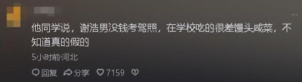 有人说,谢浩男的同学说他没钱考驾照,包括平时吃的都非常地差,但不知道是真是假。