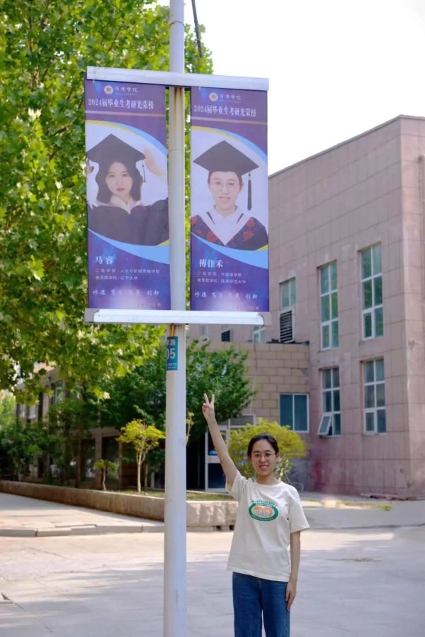 大学承载着我平凡而可贵的青春记忆,五年前,我开启了如朝阳般热烈的大学生活。菏泽学院“修德、笃学、求是、创新”的校训引领着我不断前行,去年羡慕道旗上的人,今年成为道旗上的人,很感谢菏泽学院能够提供这样一个展示学生风采的机会,道旗上的照片不仅是考研上岸荣誉的见证,更是无数个日日夜夜坚持和努力的结晶,从专科到本科再到研究生,回顾这段经历,我深感自己的成长和进步。希望学弟学妹们都能坚定自己的选择,沿途的花会一直开,以后的路也是,祝大家逐梦路上一切顺利!(化学化工学院 2022级 应用化学专升本专业 周凯璇)