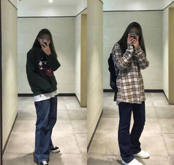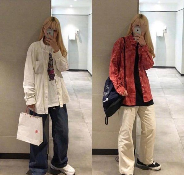 比如上图中的两种搭配中,简约款式的卫衣就明显比格子衬衫要高级一些。