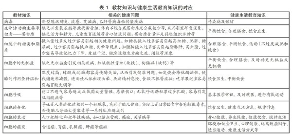 笔者以人教版高中生物必修一为例,列举出其中可滲透健康生活教育理念的教材知识、引发的健康问题及其健康教育知识(如表 1)。