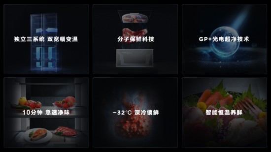 另外,这款冰箱还搭载“GP+光电超净技术”、“10分钟急速净味技术”、“智慧恒温养鲜”、“APP智能互联”、“-32℃深冷锁鲜”等科技,进一步提升消费者的使用体验。其中,“GP+光电超净技术”是TCL联合中船重工718研究所,突破性将航天级材料石墨烯催化剂与高压电场结合,通过UVC深紫外光释放出大量高活性光能电子,深入食物细胞,从而达到99.999%的行业最高杀菌率。“-32℃深冷锁鲜”专为深海鱼、高级牛排和珍贵食材设计。