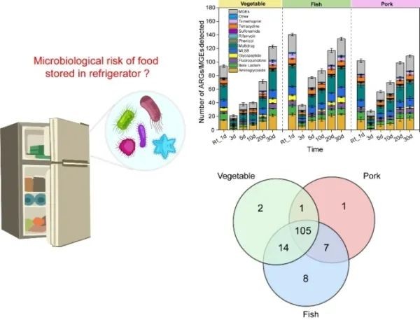 中国科学院城市环境研究所选取三种典型的中国烹饪食物(炒蔬菜、清蒸鱼、红烧肉)作为研究对象,将其置于冰箱4℃冷藏3-30天,监测抗性基因和病原菌的动态变化。研究发现,冷藏于冰箱的食物携带21-134种ARGs和MGEs(含10.06%高风险ARGs),并检测到4种致病细菌及若干种致病真菌。此外,随着冷藏时间的延长,总生物量和ARG的丰度增加,特别是清蒸鱼仅3天便显著提高,比蔬菜和肉类快(10天后)。清蒸鱼所含的ARG和病原菌的丰度最高,表明其微生物风险最高。经方差分解分析发现,冰箱冷藏食物的抗性组主要受细菌群落和MGEs的影响。研究提示,冰箱冷藏食物存在不容忽视的微生物风险,应进一步提高食品安全意识。